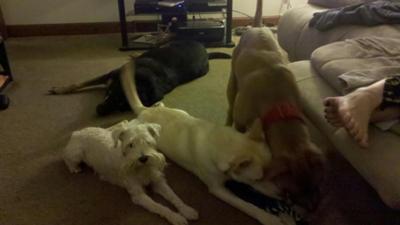 Fry is the white guy on the left obviously. The cream colored dog right next to him is Rory.