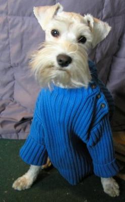 In this photo he is sporting a sweater for the first time. He enjoyed bounding through the snow drifts so much he had to be shaved after the spring thaw. Without his hair he shivered so much he vibrated sideways.