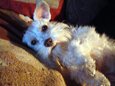 Tugly is a perfect fit, beautiful(a white chocolate with an irridescent coat), has a sense of humor and talks. Might I add, he's a real "jock" too with his double suspension gallop. Sure there isn't any IG in there??? :-) Before I leave for work, I tuck him in his bed, paws over the top, blinks at me, like a child. He stays there till my husband gets up. New dog...no, a little 12" angel.